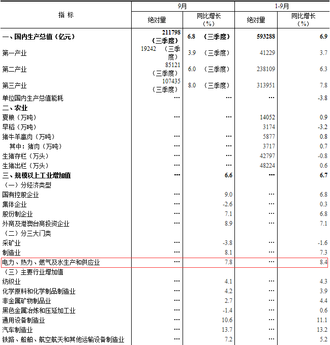 10月19日,國家統(tǒng)計局發(fā)布數(shù)據(jù)表明,前三季度國民經(jīng)濟穩(wěn)中向好態(tài)勢持續(xù)發(fā)展。前三季度,全國規(guī)模以上工業(yè)增加值同比實際增長6 7%,增速比上年同期加快0 7個百分點。其中,電力、熱力、燃氣及水生產(chǎn)和供應(yīng)業(yè)同比增