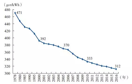 通過結(jié)構(gòu)調(diào)整、技術(shù)創(chuàng)新、科學(xué)管理等多方面的措施,2016年,全國6000kW及以上火電機組供電煤耗312gce/kWh,比1978年的471gce/kWh下降了159gce/kWh,降幅達到33.8%。1978—2016年火電供電煤耗下降情況見圖4。