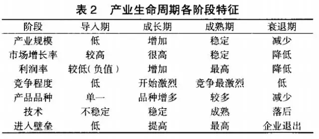 根據(jù)產(chǎn)業(yè)生命周期理論,產(chǎn)業(yè)生命周期被劃分為導(dǎo)入期、成長期、成熟期與衰退期,各階段特征如表2所示。根據(jù)國內(nèi)外學(xué)者研究,劃分產(chǎn)業(yè)生命周期常用的方法有特征分析法、經(jīng)驗對比法等。特征分析法通過產(chǎn)業(yè)的規(guī)模、市場增長率、利潤率等指標(biāo)情況識別產(chǎn)業(yè)所處階段。經(jīng)驗對比法將發(fā)達(dá)地區(qū)的產(chǎn)業(yè)發(fā)展規(guī)律與后進(jìn)地區(qū)進(jìn)行比較分析,以判斷后進(jìn)地區(qū)產(chǎn)業(yè)所處階段。