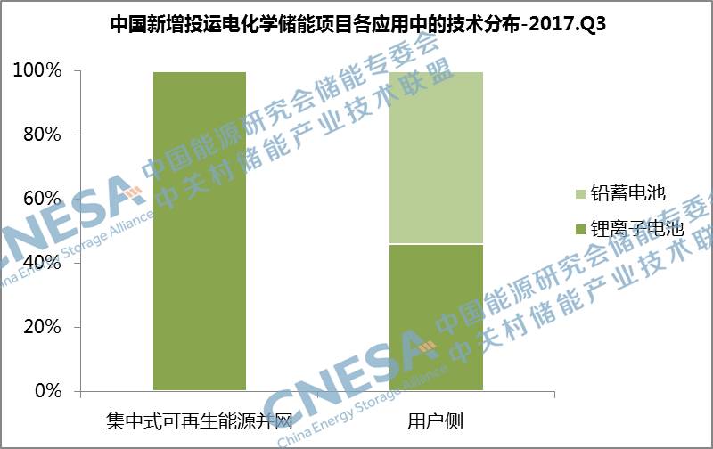 從應(yīng)用分布上看,新增投運項目全部應(yīng)用在集中式可再生能源并網(wǎng)和用戶側(cè)領(lǐng)域,且用戶側(cè)領(lǐng)域的裝機規(guī)模最大,為17.8MW,比重為78%,同比增長67%,環(huán)比增長287%。從三季度用戶側(cè)領(lǐng)域的技術(shù)分布上看,全部應(yīng)用的鋰離子電池和鉛蓄電池技術(shù),且鉛蓄電池的裝機占比最大,為54%。