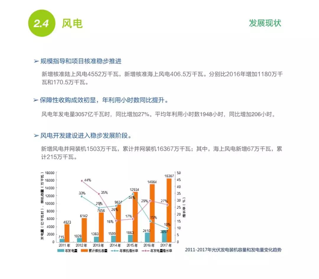 風(fēng)電方面,去年我國核準(zhǔn)的陸上風(fēng)電和海上風(fēng)電達(dá)4958萬千瓦,2017年投產(chǎn)風(fēng)電達(dá)到了1503萬千瓦,累計并網(wǎng)裝機容量1.64億千瓦。棄風(fēng)現(xiàn)象得到了有效控制,風(fēng)電單位千瓦造價持續(xù)下降,2017年部分項目的造價已經(jīng)低于每千瓦6800元。