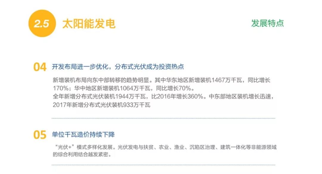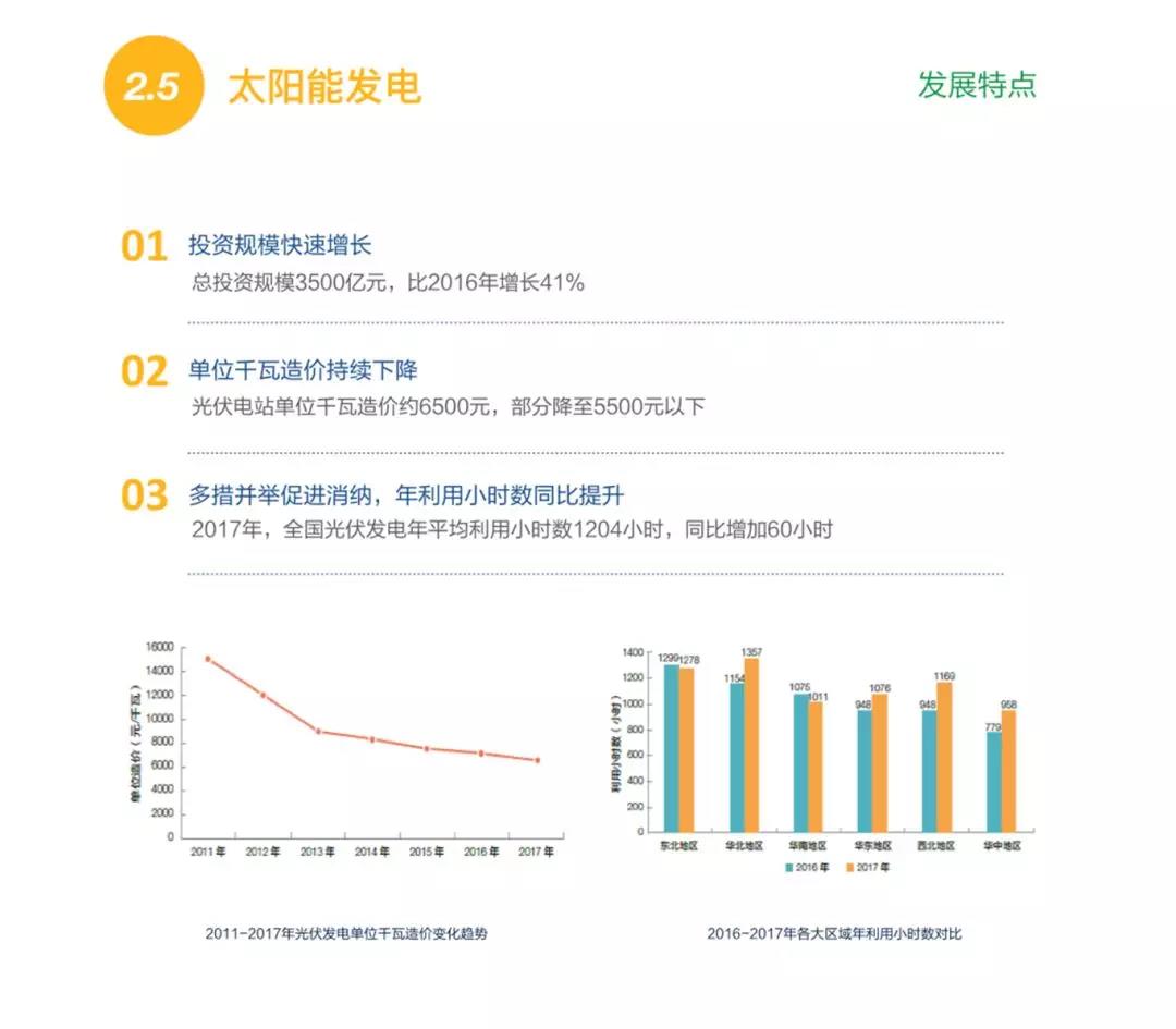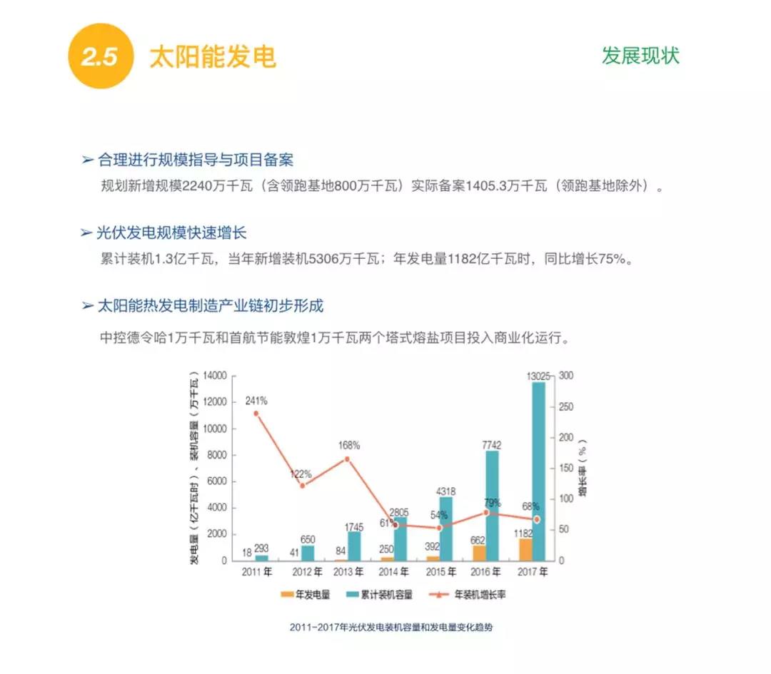 在太陽能發(fā)電方面,去年我國新增裝機5306萬千瓦,目前我國光伏發(fā)電累計裝機已達(dá)1.3億千瓦。同時,我國太陽能熱發(fā)電制造產(chǎn)業(yè)鏈也初步形成。2017年太陽光伏發(fā)電投資規(guī)??焖僭鲩L,比2016年增長了41%,同時單位千瓦造價部分已經(jīng)降低至每千瓦5500元以下,棄光的現(xiàn)象也得到了有效控制。