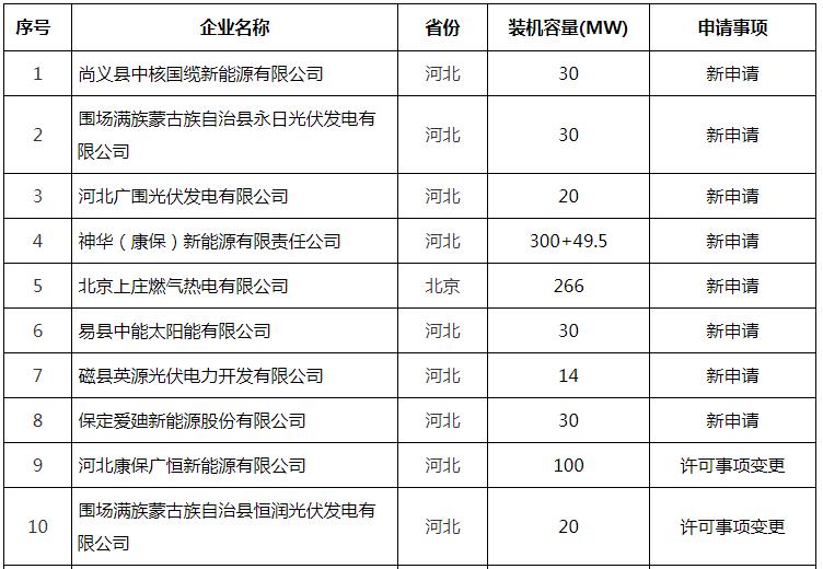 含尚義縣中核國(guó)纜新能源有限公司、神華(康保)新能源有限責(zé)任公司、北京上莊燃?xì)鉄犭娪邢薰镜?0家發(fā)電企業(yè),涉及光伏發(fā)電、風(fēng)力發(fā)電、熱電等多個(gè)發(fā)電領(lǐng)域。