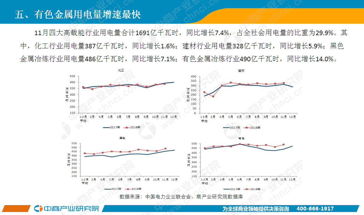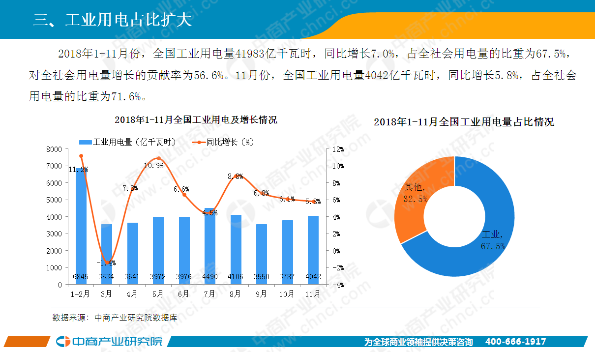 2018年11月全國(guó)全社會(huì)用電量5647億千瓦時(shí),同比增長(zhǎng)6.3%。1-11月全國(guó)全社會(huì)用電量62199億千瓦時(shí),同比增長(zhǎng)8.5%,增速比上年同期提高2.0個(gè)百分點(diǎn)。分產(chǎn)業(yè)看注,1-11月第一產(chǎn)業(yè)用電量673億千瓦時(shí),對(duì)全社會(huì)用電量增長(zhǎng)的貢獻(xiàn)率為1.3%;第二產(chǎn)業(yè)用電量42684億千瓦時(shí),對(duì)全社會(huì)用電量增長(zhǎng)的貢獻(xiàn)率為58.1%;第三產(chǎn)業(yè)用電量9890億千瓦時(shí),對(duì)全社會(huì)用電量增長(zhǎng)的貢獻(xiàn)率為23.0%;城鄉(xiāng)居民生活用電量8952億千瓦時(shí),對(duì)全社會(huì)用電量增長(zhǎng)的貢獻(xiàn)率為17.6%。