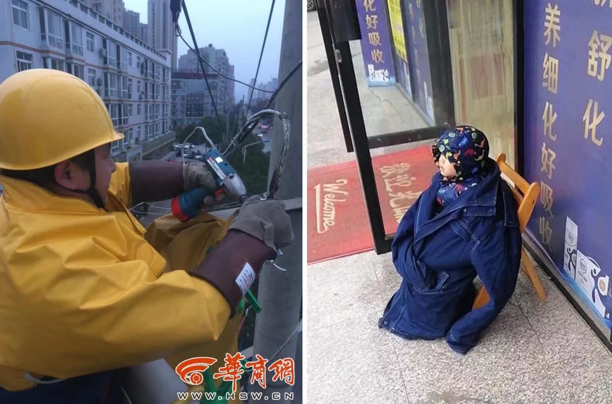 2019年感人瞬間 守望與守護(hù):爸爸高空檢修電 3歲兒子路邊等到睡著