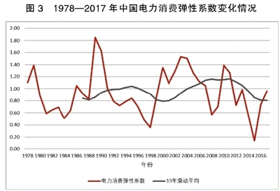 從1978年到2017年我國(guó)電力消費(fèi)彈性系數(shù)(全社會(huì)用電量增速/GDP增速)來(lái)看,各年的彈性系數(shù)值在0—2之間,且年際間波動(dòng)較大,體現(xiàn)不出電力消費(fèi)是經(jīng)濟(jì)增長(zhǎng)“晴雨表”的穩(wěn)定關(guān)系;但10年滑動(dòng)平均彈性系數(shù)曲線在0.8—1.2之間,且呈現(xiàn)出較規(guī)律性的波動(dòng),既反映出了“晴雨表”特性,也反映出彈性系數(shù)的周期性變化(見(jiàn)圖3)。
