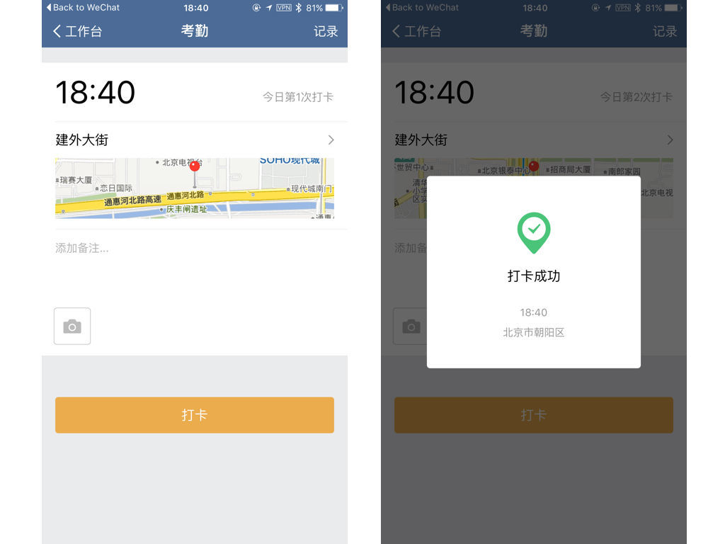 還有一個(gè)比較可怕的打卡功能,就是直接抓取員工的地理位置打卡,也可以作為考勤的一部分,員工不能手動(dòng)調(diào)整距離太遠(yuǎn)的位置來(lái)打卡。