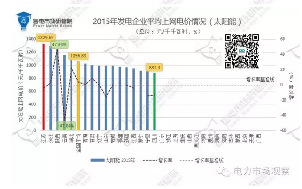 2015年,全國(guó)發(fā)電企業(yè)平均上網(wǎng)電價(jià)為388.25元/千千瓦時(shí),同比下降2.61%。其中,太陽(yáng)能發(fā)電最高,為1056.89元/千千瓦時(shí),水力發(fā)電最低,為286.93元/千千瓦時(shí)。