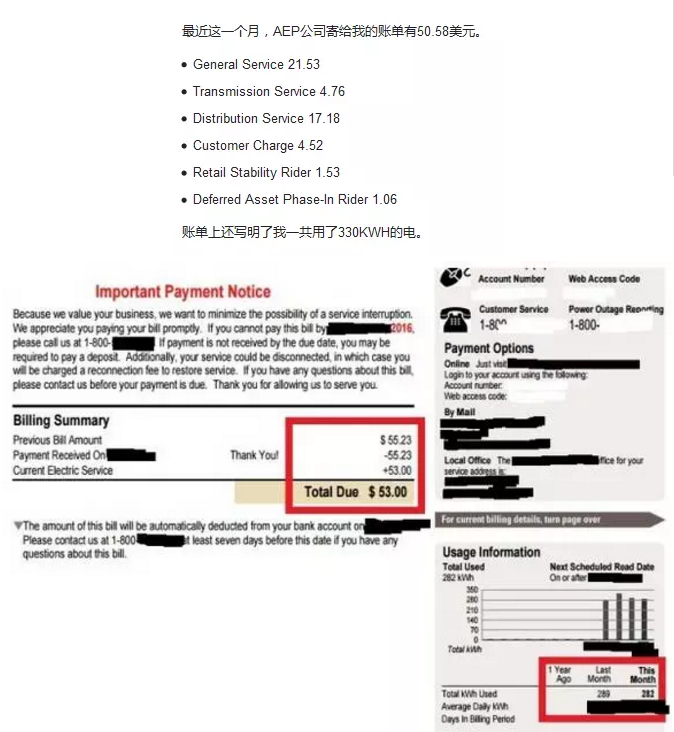 住美國(guó)南方農(nóng)村的網(wǎng)友曬出賬單,一個(gè)月用電不到三百度,電費(fèi)超過(guò)50刀??梢钥吹矫绹?guó)一些農(nóng)村地區(qū)電價(jià),相對(duì)于收入也不便宜