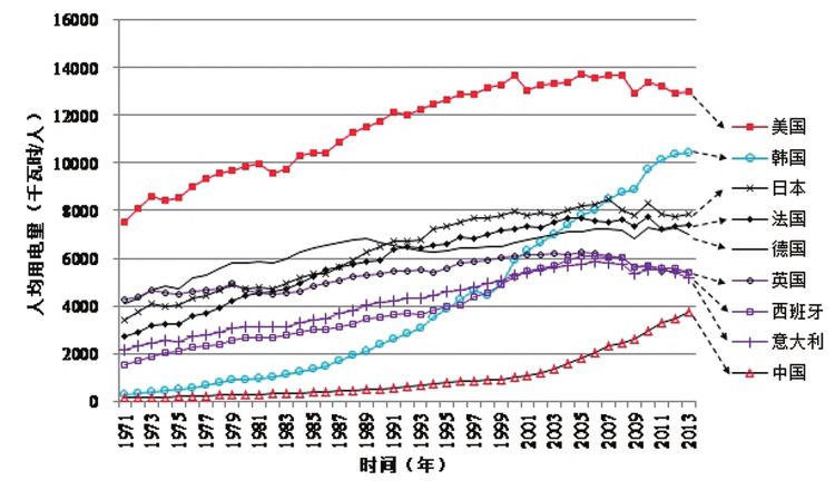 圖2:可對比發(fā)達國家與中國人均用電量的歷史變化趨勢