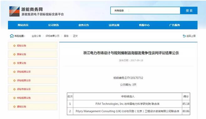 昨天(9月18日),浙能商務(wù)網(wǎng)發(fā)布了浙江電力市場設(shè)計與規(guī)則編制咨詢服務(wù)競爭性談判評議的結(jié)果公示,兩個聯(lián)合體進入公示名單,得分第一的是PJM Technologies,Inc 與中國電力科學(xué)研究院聯(lián)合體(85 18分),緊隨