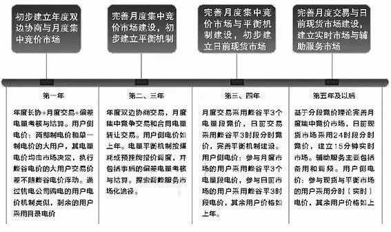 我國電力市場交易機制的建立是從年度、月度等中長期電量交易開始的。結(jié)合“基本規(guī)則”提出電力中長期交易到現(xiàn)貨交易的時序路線規(guī)劃,如下圖所示,供市場設(shè)計者、運營者、監(jiān)管者及市場主體參考。圖中時間節(jié)點只是大致估算,最終取決于各地市場建設(shè)的實際進展。
