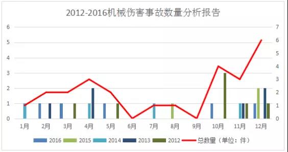 中電傳媒電力傳媒數(shù)據(jù)研發(fā)跟蹤數(shù)據(jù)顯示,2012~2016年間機(jī)械傷害事故在前三季度較為平穩(wěn),僅4月存在一個(gè)小高峰,而6月和9月為全年最低點(diǎn),均沒(méi)有發(fā)生事故。而進(jìn)入10月份以來(lái),機(jī)械傷害事故數(shù)量開(kāi)始明顯上漲。