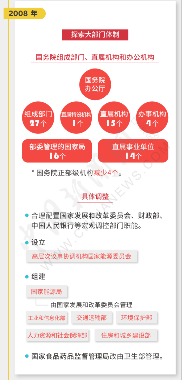 第六次改革于2008年啟動,主要任務(wù)是,圍繞轉(zhuǎn)變政府職能和理順部門職責(zé)關(guān)系,探索實行職能有機(jī)統(tǒng)一的大部門體制。