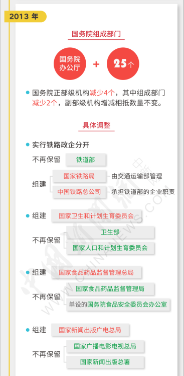 在這次改革中,組建了國家衛(wèi)生和計劃生育委員會、國家食品藥品監(jiān)督管理總局、國家新聞出版廣電總局,重新組建了國家海洋局、國家能源局,不再保留國家電力監(jiān)管委員會等。