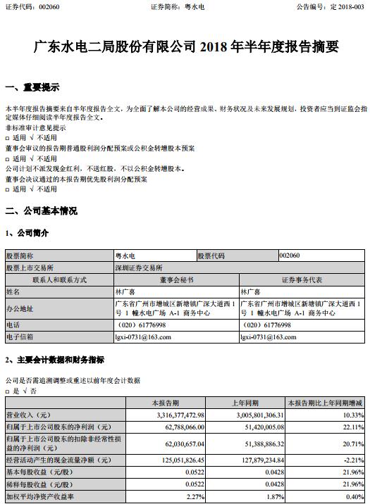 粵水電發(fā)布2018年半年度報告,報告顯示:報告期內(nèi),公司實現(xiàn)總資產(chǎn)18,196,813,414.54元,比上年度末增長3.89%;歸屬于上市公司股東的凈資產(chǎn)2,893,163,435.69 元,比上年度末增長0.87%;營業(yè)總收入3,316,377,472.98元,同比增長10.33%;歸屬于上市公司股東的凈利潤62,788,066.00 元,同比增長22.11%。