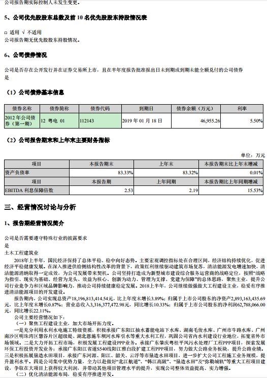 粵水電發(fā)布2018年半年度報告,報告顯示:報告期內(nèi),公司實現(xiàn)總資產(chǎn)18,196,813,414 54元,比上年度末增長3 89%;歸屬于上市公司股東的凈資產(chǎn)2