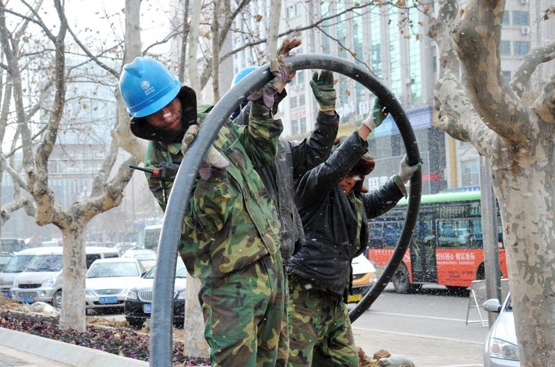 國(guó)家電網(wǎng)山東威海供電公司作業(yè)人員正在冒雪為市中心地下變電站35千伏寶泉站進(jìn)行高壓電纜線路敷設(shè)。