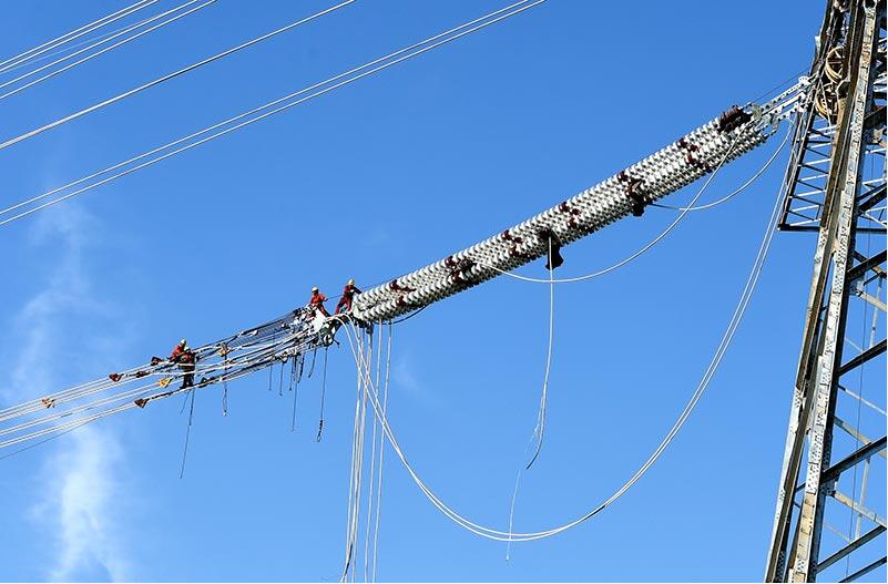 【背景】施工人員在錫盟—泰州±800千伏直流特高壓工程蘇2標(biāo)段N6997號(hào)轉(zhuǎn)角塔安裝絕緣子?! ∵B日來(lái),在錫盟—泰州±800千伏直