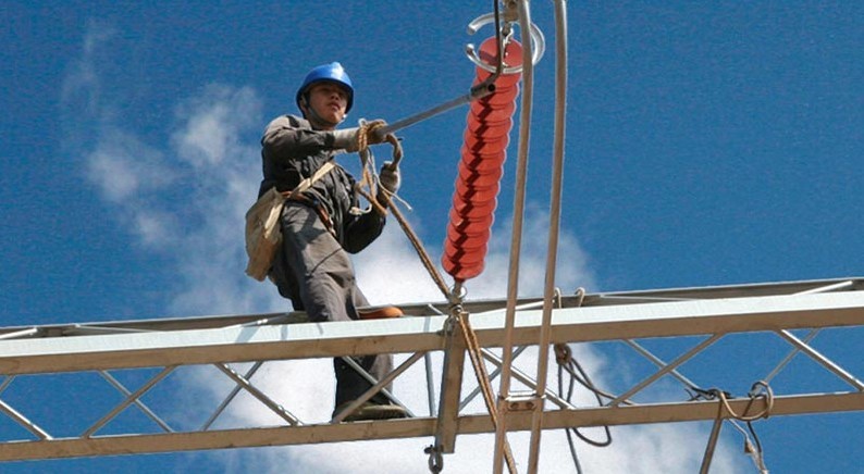 圖為變電站建設(shè)人員在架設(shè)110千伏臨江智能變電站母線