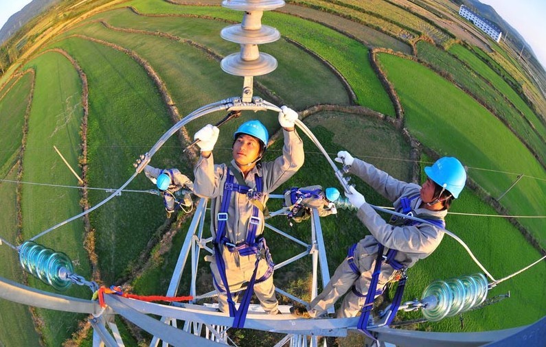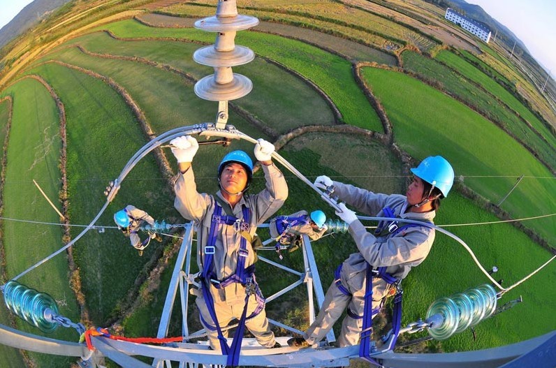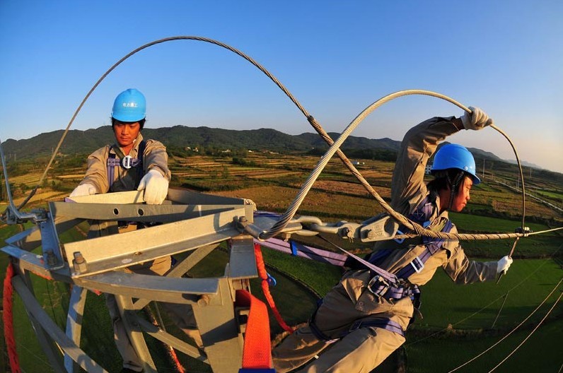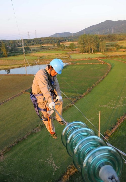 2013年10月1日,在安徽省滁州市南譙區(qū)境內,電力職工在40多米的高空對輸電線路進行檢修維護。當日是國慶節(jié),為了讓群眾安度佳節(jié),國慶十一長假期間,安徽省滁州市共有1100余名電力職工主動放棄休假,堅守一線崗