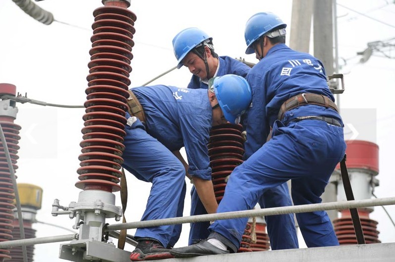 4月22日上午,四川成都電業(yè)局檢修公司檢修人員在110千伏金花變電站進行設備檢修。在地震中,金花變電站主變移位,部分線路絕緣子斷裂。 作者:李國洲 來源:《國家電網(wǎng)報》