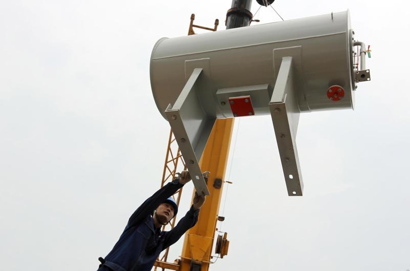 2013年5月7日,河南省安陽縣35千伏瓦店變電站施工現(xiàn)場(chǎng),電力員工正在吊裝主變油枕正確就位。