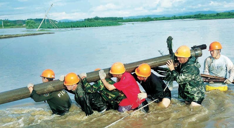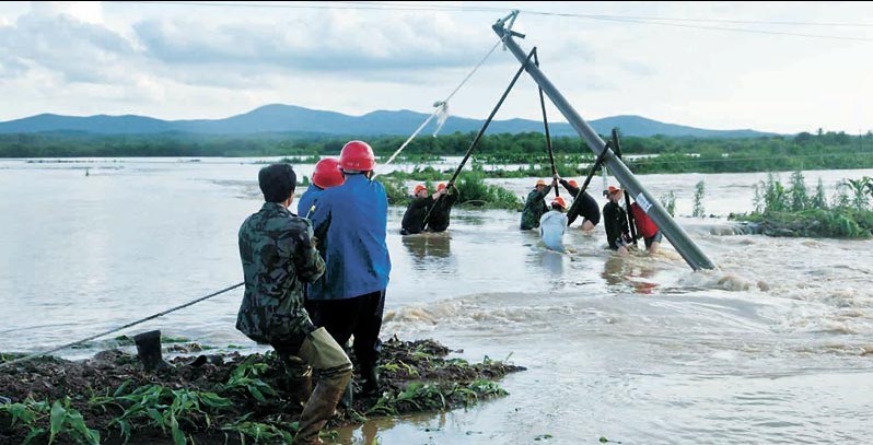 7月5日下午,黑龍江尚志市供電公司搶修人員在齊腰深的洪水中架設(shè)電桿。進(jìn)入7月,連續(xù)強降雨導(dǎo)致尚志市多處河道漲水,部分地區(qū)突發(fā)山洪,多條10千伏線路不同程度受損。災(zāi)情發(fā)生后,尚志市供電公司迅速啟動防汛預(yù)
