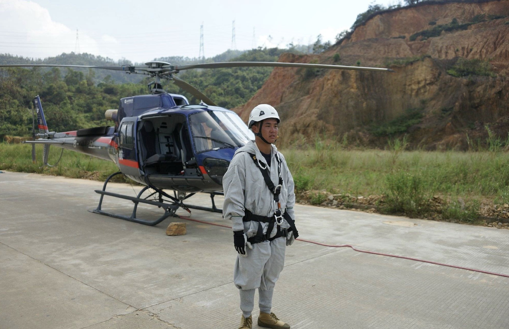 直升機(jī)起飛前,南方電網(wǎng)帶電作業(yè)人員“全副武裝”。湯子隆 胡家玥 攝