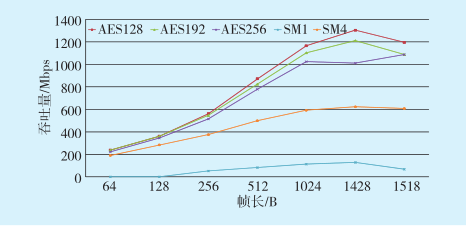 同加密算法條件下量子VPN的吞吐量測試結(jié)果如圖5所示,描述了不同幀長條件下量子VPN的3種加密算法單向吞吐量測試結(jié)果對比。其中AES算法采用了3種密鑰長度。隨著數(shù)據(jù)幀長的增加,所有算法的吞吐量皆呈現(xiàn)增大趨勢,因此幀長越大量子VPN能傳輸更多的數(shù)據(jù)量;除了AES-256,其他加密算法都在幀長為1 428 B時達到最大吞吐量??傮w上,AES算法在不同密鑰長度下,吞吐量性能具有很好的穩(wěn)定性。而SM1和SM4的吞吐量明顯低于AES算法,例如在幀長為1 428 B時,SM4的吞吐量約為AES-128的48%。因此,在考慮承載大數(shù)據(jù)量電網(wǎng)業(yè)務(wù)(如數(shù)據(jù)容災(zāi)備份)保密傳輸時,必須要針對具體廠商量子VPN設(shè)備的加密算法進行選擇。
