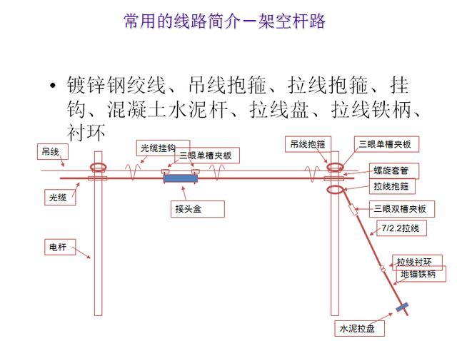 長途光纜線路工程的主體物品由光纜和光纜接頭盒構(gòu)成,其他物品有光配線架(ODF)、光纜尾纖、適配器、鍍鋅鋼絞線、吊線抱箍、拉線抱箍、掛鉤、混凝土水泥桿、拉線盤、拉線鐵柄、襯環(huán)等。