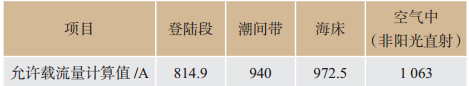 90 ℃,由圖1可以得出各區(qū)段海底電纜允許通過的最大載流量大小(見表3),可知,限制海底電纜載流量的主要瓶頸在登陸段,海底電纜允許通過的最大載流量為814.9 A,與廠家提供的815 A基本一致。