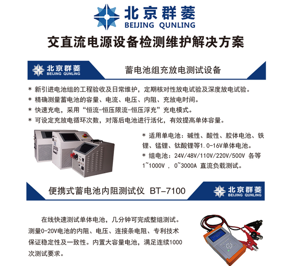 群菱專業(yè)致力于蓄電池檢測領(lǐng)域,可以根據(jù)用戶現(xiàn)場需求,制作詳細(xì)檢測技術(shù)方案。北京群菱的蓄電池維護(hù)測試技術(shù)方案主要有: