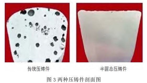 在半固態(tài)壓鑄過程中,由于半固態(tài)合金漿料的澆注溫度控制在固液兩相區(qū)內(nèi),漿料中的固相以近球狀的非枝晶組織形式懸浮在液相基體中,使熔體具有良好的流動性,可以制作壁厚較薄的零件,同時在一定強度攪拌的作用下漿料以分布均勻,細小的非枝晶、近球狀的顯微組織凝固;在漿料充型過程中,半固態(tài)金屬的流動屬于層流,避免了氣體的卷人,且由于澆注溫度處于固液兩相區(qū),顯著降低了鑄件內(nèi)部的氣孔含量,使鑄件組織致密。兩種壓鑄件剖開后的截面效果如圖3 所示。