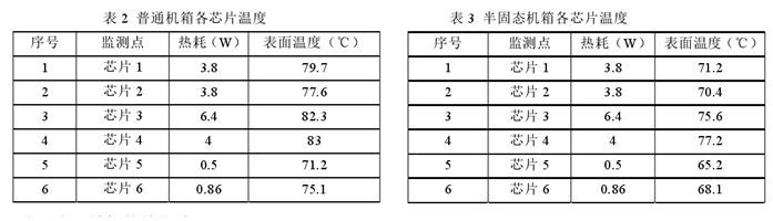 普通液態(tài)壓鑄機箱安裝 PCB 板后,設(shè)備在 40℃環(huán)境中工作時各芯片的表面溫度實測數(shù)據(jù)如下表2 所示。