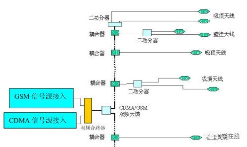 通過(guò)雙頻合路器把 CDMA 信號(hào)和 GSM 信號(hào)和為一路接入同一天饋系統(tǒng),實(shí)現(xiàn)CDMA 與 GSM 的雙網(wǎng)覆蓋。如下圖所示: