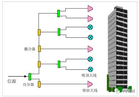 無(wú)源系統(tǒng)主要由分/合路器、功分器、耦合器、饋線(xiàn)、天線(xiàn)組成。無(wú)源系統(tǒng)沒(méi)有有源設(shè)備故障率低、可靠性高、幾乎不需要維護(hù)、且容易擴(kuò)展。但信號(hào)在饋線(xiàn)及各器件中傳遞時(shí)產(chǎn)生的損耗無(wú)法得到補(bǔ)償,因此覆蓋范圍受信源輸出功率影響較大。信源輸出功率大時(shí),無(wú)源系統(tǒng)可應(yīng)用于大型室內(nèi)覆蓋工程,如大型寫(xiě)字樓、商場(chǎng)、會(huì)展中心等;信源功率較小時(shí),無(wú)源系統(tǒng)僅應(yīng)于小范圍區(qū)域覆蓋,如小的地下室、超市等。如下圖: