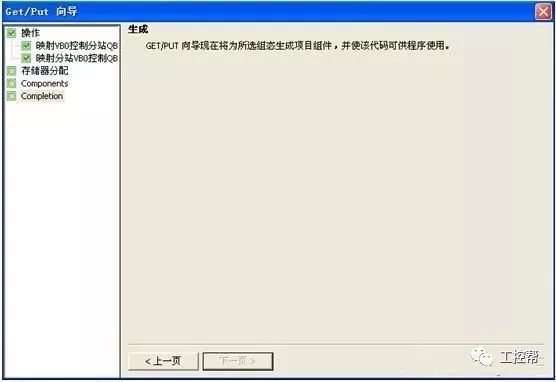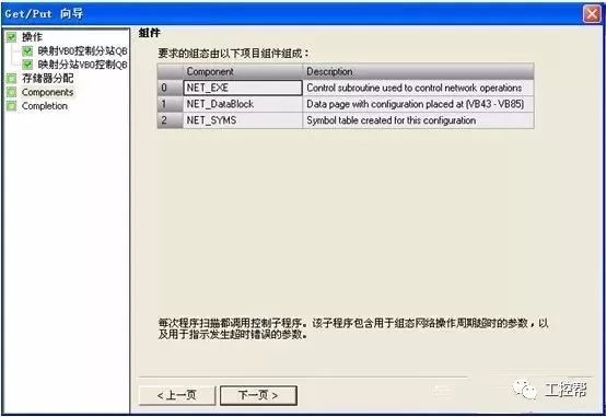 繼續(xù)點(diǎn)擊“下一頁(yè)”,出現(xiàn)“組件”界面。剛剛的組態(tài)生成一個(gè)邏輯控制塊、一個(gè)符號(hào)表、一個(gè)數(shù)據(jù)塊。
