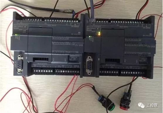 將分控程序下載進(jìn)分站PLC,如上圖將2臺(tái)PLC網(wǎng)口用網(wǎng)線連接起來(lái),紅色按鍵按下鎖定(接于主機(jī)I0.0位),此時(shí)檢測(cè)到主機(jī)I0.0上升沿,分機(jī)PLCQ0.0~Q0.7全部輸出(上圖左邊PLC下端一排綠燈)
