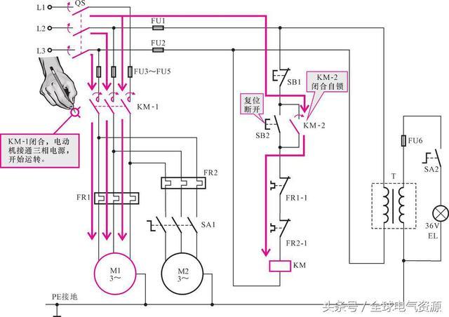 交流接觸器KM線圈得電后,常開輔助觸點(diǎn)KM-2閉合自鎖,使KM線圈保持得電。常開主觸點(diǎn)KM-1閉合,電動(dòng)機(jī)M1接通三相電源,開始運(yùn)轉(zhuǎn)。