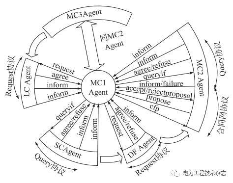 根據(jù)圖1所示直流微電網(wǎng)結(jié)構(gòu)模型,構(gòu)建適用于圖2分區(qū)域式穩(wěn)定控制決策流程的多代理系統(tǒng),其中包括區(qū)域各發(fā)用電單元對應(yīng)的Agent,以及系統(tǒng)級(jí)的DF Agent和完備的點(diǎn)對點(diǎn)通信網(wǎng)絡(luò),DF Agent的作用在于給各MC Agent提供發(fā)布、更新和刪除各區(qū)域供電裕量和運(yùn)行狀態(tài)的信息平臺(tái),但不具備傳統(tǒng)集中控制的主動(dòng)協(xié)調(diào)能力;點(diǎn)對點(diǎn)通信網(wǎng)絡(luò)為Agent間的通信交互提供了網(wǎng)絡(luò)支持。