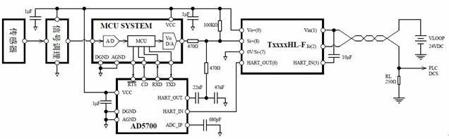 在智能儀表中,除了要傳輸4~20mA的模擬量信號,還要求具備Hart通信功能。這時可以采用TS107L-F-2的Hart版TS107HL-F-2。和TS107L-F-2的主要區(qū)別在于,TS107HL-F-2多了一路Hart信號隔離傳輸接口,如圖5所示。由于TS107HL-F-2本身具備電壓信號轉(zhuǎn)4~20mA電流信號的功能,類似于ADI的AD5421,因此只要采用AD5700在電壓信號輸入端耦合進(jìn)Hart信號就可以實(shí)現(xiàn)Hart信號的發(fā)送。Hart信號的返回則通過TS107HL-F-2的自帶Hart信號隔離接口實(shí)現(xiàn)信號的回傳。