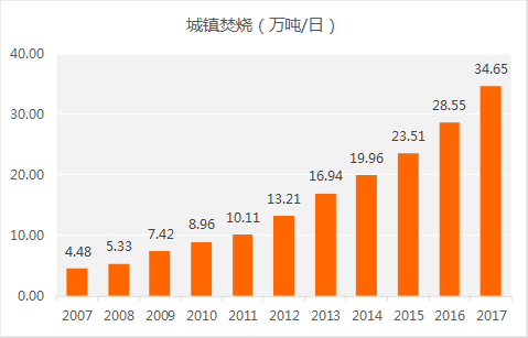 2007-2017已建成垃圾焚燒規(guī)模(萬噸/日)