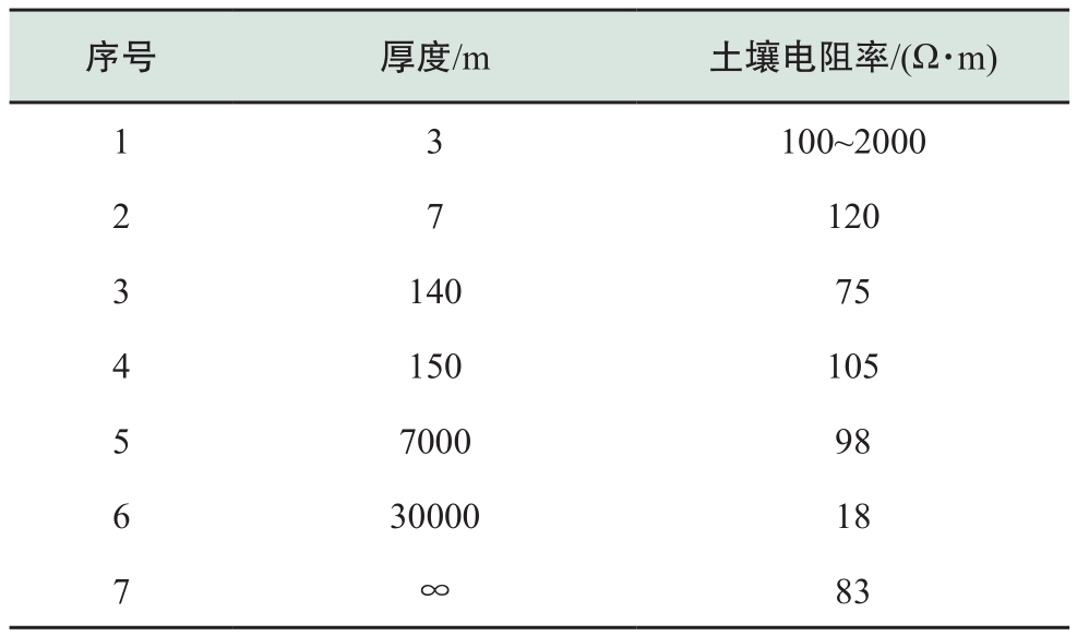 糯扎渡送電廣東±800 kV 特高壓直流輸電工程,容量5000 MW,額定電流3125 A。起于云南普洱換流站,止于廣東江門換流站,普洱換流站為送端,單極大地額定電流持續(xù)運(yùn)行時(shí)間按3天考慮。普洱換流站極址土壤分層電阻率情況如表1[11] 所示。