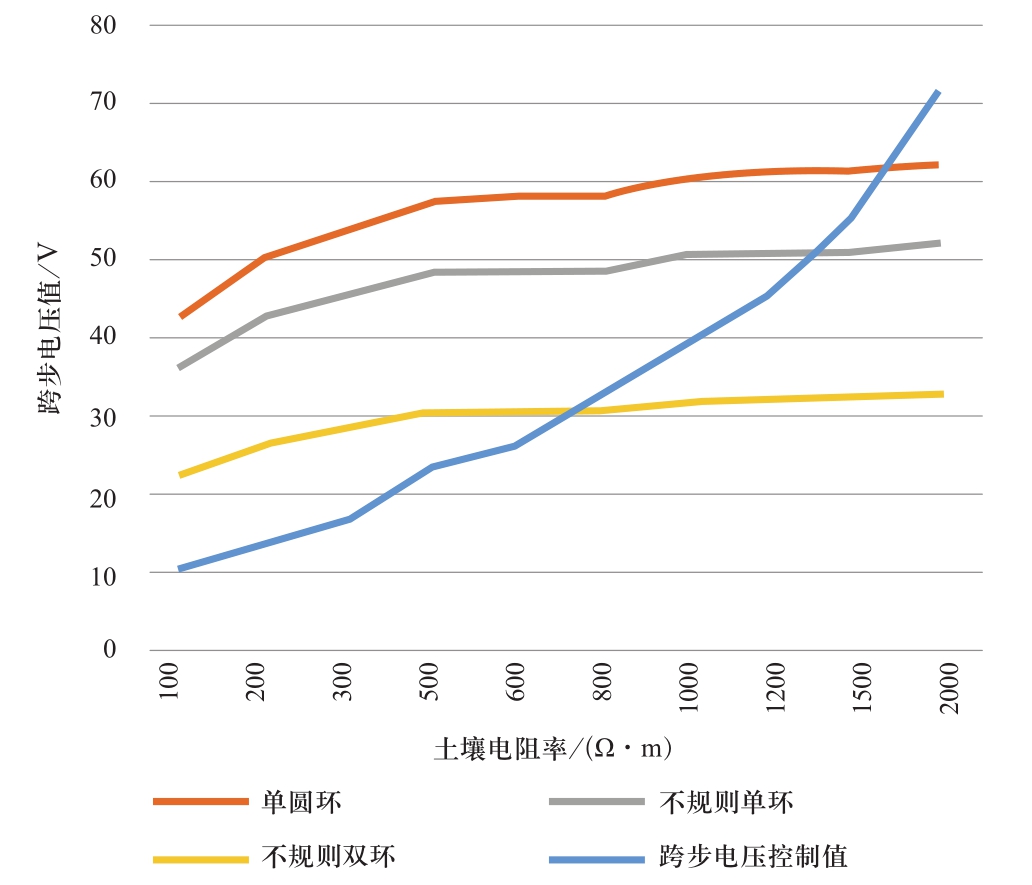 由圖2可知, 3種水平型接地極設(shè)計(jì)方案,在土壤電阻率在0~2000 Ω˙m范圍內(nèi),在極址面積受嚴(yán)格限制條件下,單圓環(huán)方案、不規(guī)則單圓環(huán)方案、不規(guī)則雙圓環(huán)方案下的跨步電壓逐級(jí)減小??绮诫妷河?jì)算值最小的不規(guī)則雙環(huán)型接地極設(shè)計(jì)方案,在表層土壤電阻率小于800 Ω˙m的情況下,接地極的跨步電壓就超過其控制值。而推薦極址表層土壤電阻率受天氣影響較大,在100~2000 Ω˙m范圍內(nèi)波動(dòng)。因此,水平型接地極設(shè)計(jì)方案不能滿足跨步電壓的設(shè)計(jì)要求。