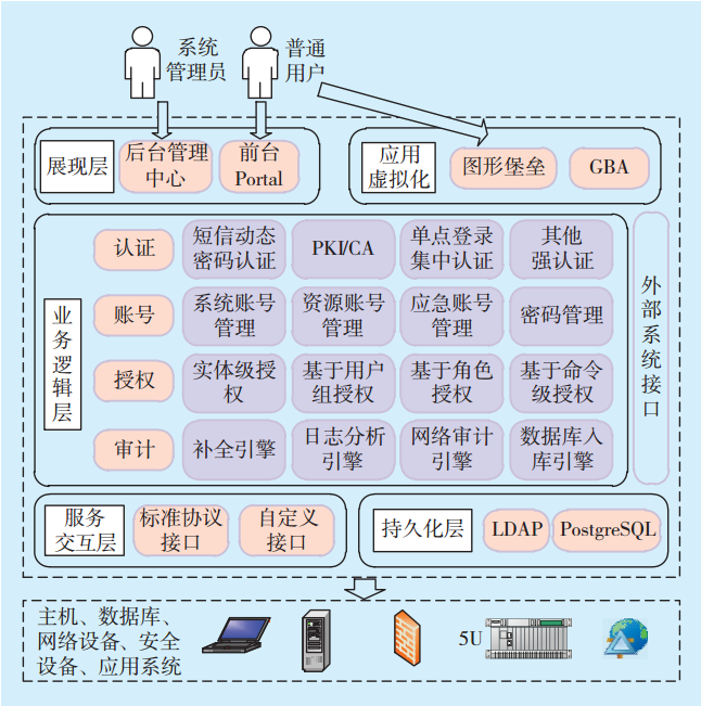 1)模塊架構(gòu)。運維安全審計模塊總體架構(gòu)分為6個層面:展現(xiàn)層、業(yè)務(wù)邏輯層、服務(wù)交互層、持久化層、虛擬化層、外部系統(tǒng)接口層(見圖2)。①用戶通過展現(xiàn)層訪問系統(tǒng)、維護系統(tǒng)。②業(yè)務(wù)邏輯層是核心功能模塊,實現(xiàn)自然人與賬號的關(guān)聯(lián)、用戶身份認證、賬號權(quán)限管理、違規(guī)操作告警、用戶行為審計等功能。它通過服務(wù)交互層實現(xiàn)全設(shè)備管控,并將數(shù)據(jù)通過展現(xiàn)層向用戶展示。③服務(wù)交互層通過2種不同的接口類型實現(xiàn)對異構(gòu)的資源進行管理。④持久化層采用LDAP、PostgreSQL數(shù)據(jù)庫實現(xiàn)對資源信息的存儲整理。⑤外部系統(tǒng)接口層幫助展現(xiàn)層和服務(wù)交互層實現(xiàn)與統(tǒng)一權(quán)限系統(tǒng)賬號口令功能以及與I6000系統(tǒng)設(shè)備信息的集成。