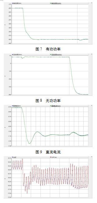 功率階躍是模塊化多電平換流器中最為常見(jiàn)的工況,在仿真平臺(tái)中模擬功率階躍以驗(yàn)證真實(shí)模型與快速模型的一致性。在3.5s時(shí)進(jìn)行有功功率的階躍響應(yīng),有功功率由-0.5p.u變?yōu)?1p.u。在4s時(shí)進(jìn)行無(wú)功功率的階躍響應(yīng),無(wú)功功率由0.1p.u降為-0.5p.u。圖7給出了有功功率仿真結(jié)果,包括所有子模塊采用實(shí)際結(jié)構(gòu)(簡(jiǎn)稱(chēng)真實(shí)模型)和采用橋臂時(shí)變Thevenin等值電路(簡(jiǎn)稱(chēng)快速模型)兩種模型。圖8給出了無(wú)功功率波形。圖9給出了直流電流波形。圖10給出了a相上橋臂子模塊電容電壓集合平均值。圖11給出了交流電流波形圖。