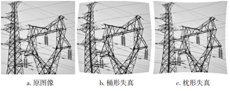 另一種情況是由于傳感器、光學(xué)系統(tǒng)和數(shù)碼相機(jī)內(nèi)部圖像處理器的差異,導(dǎo)致數(shù)碼圖像與真實(shí)拍攝環(huán)境存在差異。解決這種類型的圖像失真或者像差,需要從設(shè)備的運(yùn)行結(jié)構(gòu)上進(jìn)行分析,通過圖像處理系統(tǒng)對采集到的設(shè)備圖像進(jìn)行后期校正。圖像失真的程度取決于采集系統(tǒng)所采用的元器件的精度和集成系統(tǒng)的工作原理,失真程度低的圖像采集設(shè)備伴隨著高成本。在實(shí)際工程中,圖像采集設(shè)備多數(shù)采用消費(fèi)級的攝像頭,限于鏡頭的工作方式,獲取到的圖像與實(shí)際圖像存在偏差。在正常拍攝條件下,數(shù)碼相機(jī)鏡頭邊緣部分的放大率與中心部分放大率不一致會引起圖像畸變,主要分為桶形畸變和枕形畸變[9-10]。桶形失真是因光線的傾斜度大而引起的一種成像缺陷,像點(diǎn)會隨著與中心點(diǎn)距離的增大而移位。圖像桶形失真中的直線中間段向外彎曲,兩端則向中心彎曲,形成四角向內(nèi)收縮,邊線中段則向外凸出,普通消費(fèi)級數(shù)碼相機(jī)的桶形失真率通常為1%。枕形失真是指由鏡頭引起的畫面向中間“收縮”的現(xiàn)象,使用長焦鏡頭或變焦鏡頭的長焦端時,容易出現(xiàn)枕形失真現(xiàn)象,普通消費(fèi)級數(shù)碼相機(jī)的枕形失真率通常為0.4%。圖像采集系統(tǒng)獲取到的畸形圖像如圖1所示,可以看出圖1b和圖1c中的鐵塔垂直線分別向外凸出和向內(nèi)凹進(jìn)。