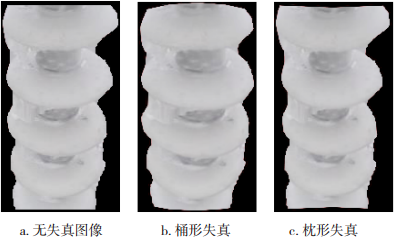 由于基于圖像處理技術(shù)的電力設(shè)備監(jiān)測系統(tǒng)采用的圖像采集設(shè)備各異、運(yùn)行環(huán)境多樣、焦距動態(tài)變化,獲取到的監(jiān)測圖像存在畸形和像差,嚴(yán)重影響了對設(shè)備運(yùn)行狀態(tài)的分析。尤其是精密設(shè)備儀表的刻度識別、電塔的穩(wěn)定狀況分析以及設(shè)備采用部件的精度確認(rèn)。絕緣子覆冰圖像失真如圖3所示,模擬了絕緣子在覆冰情況下的桶形失真圖像和枕形失真圖像。對比圖中的3種情況,可以直觀地看出失真圖像對絕緣子覆冰厚度的判別存在影響。同時,失真圖像表現(xiàn)出絕緣子本體的部分結(jié)構(gòu)特征存在變形。