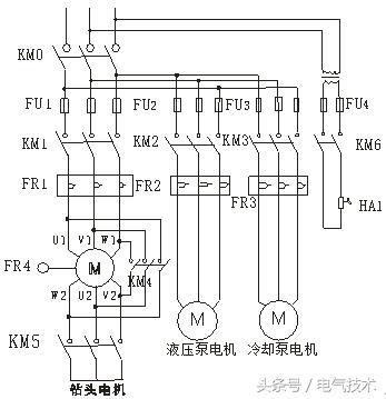 圖1中鉆頭電機采用Y-△起動,由KM1、KM4、KM5控制;液壓泵電機和冷卻泵電機分別由KM2、KM3直接起動即可。接觸器KM0作急停用,當(dāng)系統(tǒng)出現(xiàn)緊急情況時,斷開KM0。FR1、FR2、FR3為熱繼電器,用于對電機進(jìn)行過載保護(hù)。FR4為溫度傳感器,當(dāng)鉆頭電機超過設(shè)定值時,控制HA2進(jìn)行聲光報警。